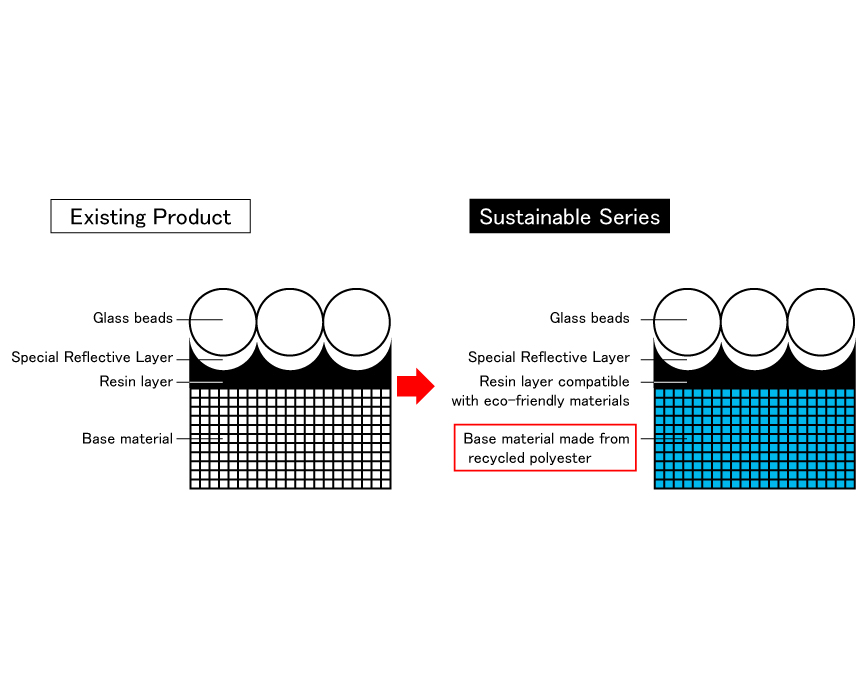 Polyester, known for its elasticity and durability, has become an essential fabric in our daily lives. However, as it is derived from petroleum and does not biodegrade, concerns about its environmental impact have been raised. With increasing awareness of environmental issues through corporate SDG initiatives, individuals are becoming more mindful of their environmental footprint. To meet this demand for low-impact materials in retroreflective products, we have collaborated with Teijin Frontier to develop a new product incorporating ECOPET®, which is now being released.